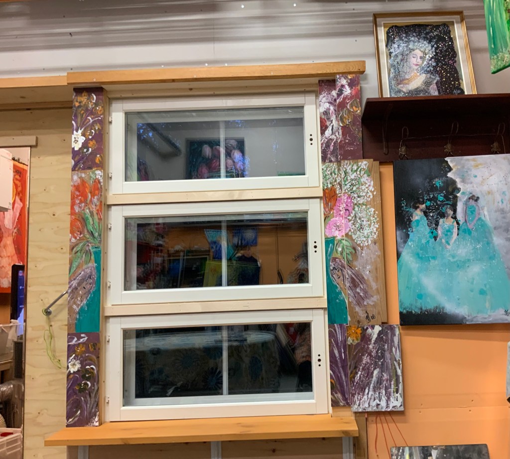 Kesällä -23 sain omaan työhuoneeseeni oven ja ikkunan. JJ teki hienoa työtä hyödyntäen varastossa ollutta ovea ja ikkunoita. Ikkunanpieliksi rakenneltiin omista maalauksistani puitteet. Voi kuinka nautin!