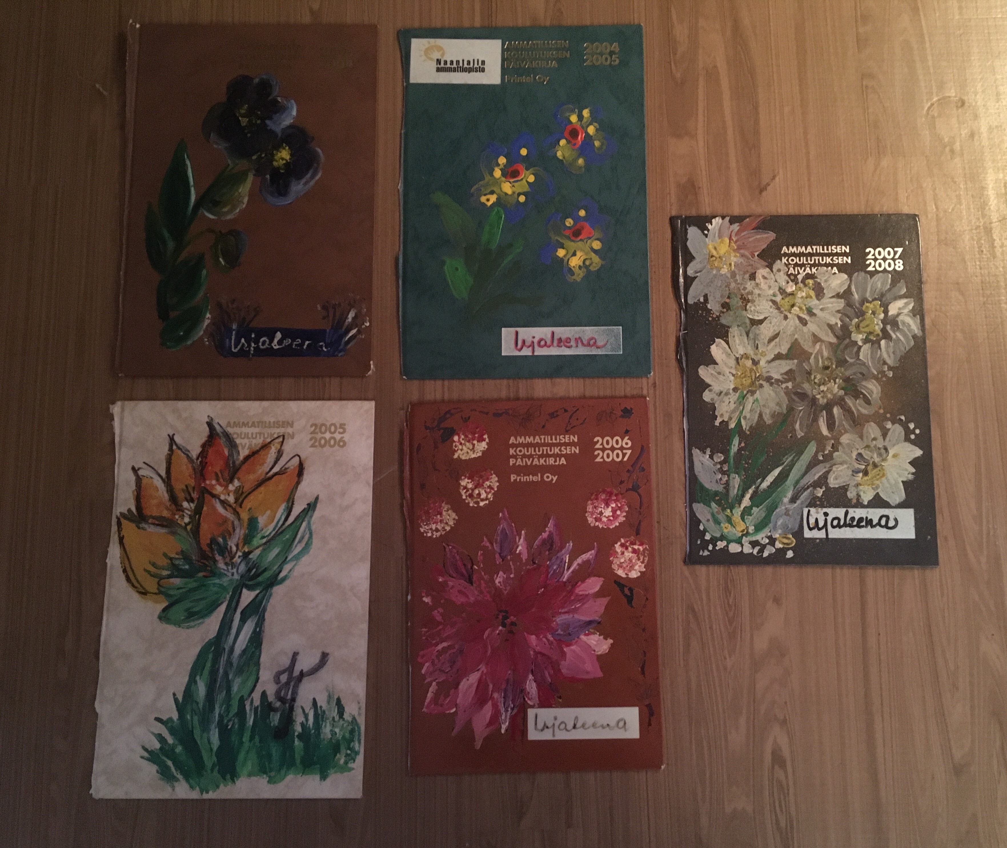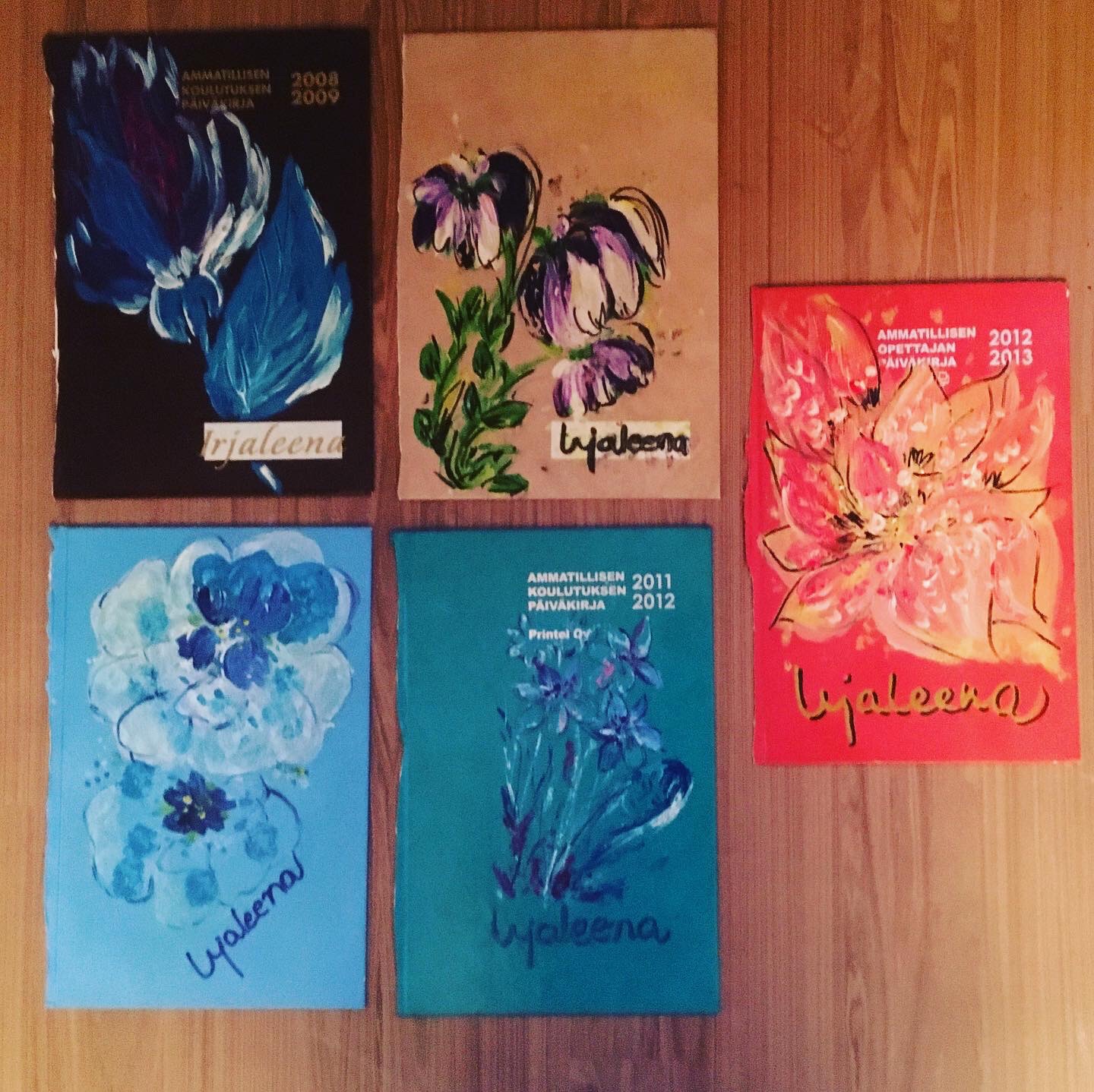 Työaikani viimeiset 10 vuotta maalasin vuosikalenterin kanteen kukkia. Jännitti aina, minkäväriset kannet tulevat. Työkaverit tulivat aina katsomaan, millainen on maalaukseni.